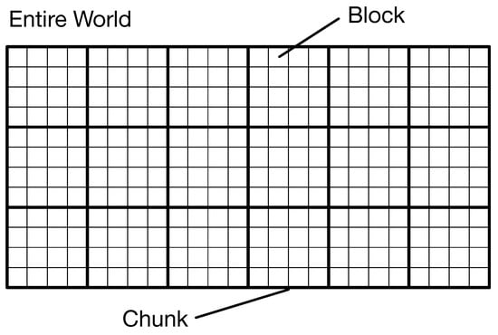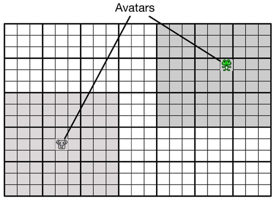 Figure 3 shows the construction of the virtual world. Our setting divides the world into small blocks. Our system manages the blocks in units called as chunks. Each chunk comprises 9 (4 × 4) blocks. The entire world comprises 18 (6 × 3) chunks. An avatar exists in only one block.