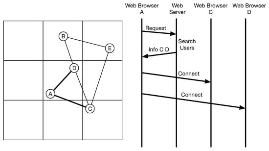 Subsequently, we proposed a method to use web browsers to host information because the number of browsers increases when the number of users increases [,]. Furthermore, the web browser displays a part of the virtual world, indicating that the browser requires limited information. This could possibly reduce the number of communications. We try sharing the information using a network of web browsers. Our system constructs a web browser network by using web real-time communication (WebRTC) [] to provide features to communicate among web browsers without web servers. This network achieves approximately 50% of data coverage, which is insufficient for the virtual world. The web browser cannot display the complete game world. For example, the browser cannot display the other users even though the user exists in the game world. This situation inhibits the fairness and consistency of the game. Therefore, we must achieve 100% data coverage.