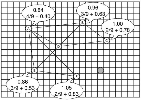 Figure 6 shows an example of network construction using our method. In this figure, there are six white nodes and one gray node. The gray node indicates the new node, whereas the white nodes indicate existing nodes. Each white node has the probability that is the summation of the value based on the distance and the value based on the number of connections. The left-side value is the probability of the distance, and the right-side value is that of the number of connections. Using the traditional BA model, the new gray node connects to the nodes that have a higher number of connections. However, our method considers the distance between the new node and the existing node because the new node needs the information included in the view range. Therefore, the new node connects to nodes C and F even though node A has a higher probability based on the number of connections.