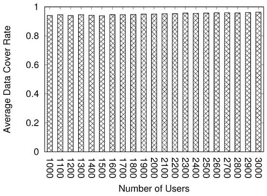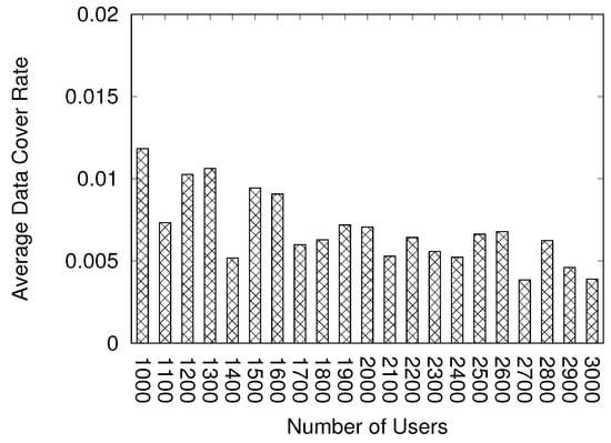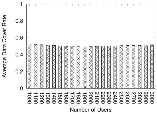 indicates the amount of information received by other users.  indicates the amount of information required to display the game world. In other words,  indicates the number of users in the view range of the user. If a user needs five user data elements to display the game screen and receives three user data elements, the data cover rate is 3/5(60%). In our simulation-based experiment, the size of the virtual world is 1500 × 1500. The chunk size is 15 × 15, indicating that the world comprises 100 × 100 (10,000) chunks. The view range is 10 chunks in one direction. If the user exists at the position (25, 25), the top-left side of the view range is (15, 15), and the bottom-right side of the view range is (35, 35). Therefore, the view range includes 441 chunks. The configuration in our experiment refers to the default configuration of Minecraft [].