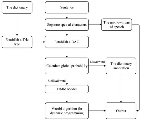 First, the crawled HTML tags are removed to generate only texts []. Then, the scanning of words and figures is realized based on the Trie tree []. A directed acyclic graph is generated according to all possible word combinations in the sentence. Dynamic programming is adopted to find the maximum probability path, so as to find the maximum segmentation and combination process based on word frequency. The Hidden Markov Model (HMM) [] is used to solve the unlogged words. That is, four implicit states are used, which are represented as a single word, the beginning of a phrase, the middle of a phrase, and the end of a phrase. Various parameters of HMM could be obtained through the marked word segmentation training set. Then, the Viterbi algorithm is used to get word sequences. Finally, a preprocessing file is formed after removing stop words. The process is shown in Figure 2.