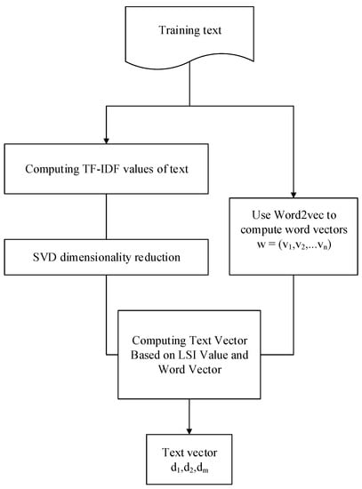 Keywords are the representatives of text features. We used the LSI-Word2vec mapping method to extract features from the preprocessed files. The specific process is shown in Figure 3. The topic model is established according to LSI, computing TF-IDF values on the basis of word frequency and the properties of words, and the dimension is reduced by SVD, finally forming a vector model.
