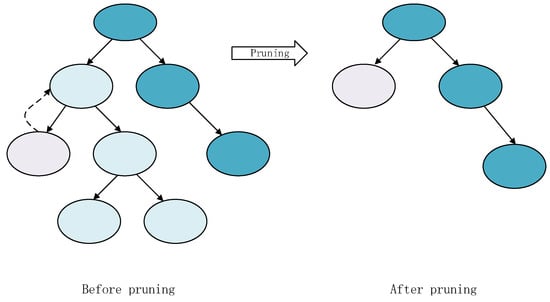 In order to simplify the stacking model, the decision tree pruning strategy was used. The main idea was to first prune a leaf node. The loss functions values of decision trees before and after pruning were compared. Then, the global optimal pruning scheme could be obtained through dynamic programming, as showed in Figure 4. When the expected error rate of a single leaf node was lower than the expected error rate of the corresponding subtree root node, the leaf node was used instead of the whole subtree.