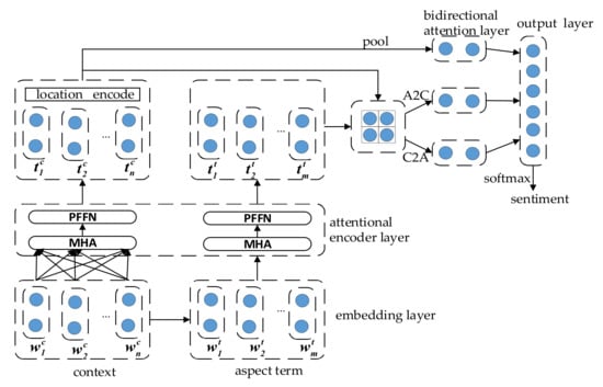 - The method proposed in this paper mainly adopts an attention network. We make use of Multihead Attention (MHA) and Point-wise Feed-Forward Networks (PFFN) to interactively obtain the hidden representation of the context and aspect term embeddings, which are akin to a partial transformer [14]. In addition, for a normal sentence that the distance between context words and aspect terms will have different effects, so this paper includes location encoding into this model.