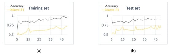 In order to verify that the method proposed in this paper could achieve better sentiment analysis results on restaurant reviews, a comparative experiment of accuracy and macro-F1 values is carried out on training set and test set. The experimental results are shown in Figure 4a,b. As is shown in Figure 4a, we could observe that with the increase of training epoch, the accuracy is also increasing. After training, the accuracy and macro-F1 value of our model are relatively stable. The performance of the test dataset is shown in Figure 4b, and its performance tends to be stable.