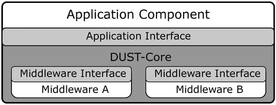 The interface requires that the middleware can deliver the serialized message to other application components based on the publish subscribe paradigm. In this research, we used the messaging protocols MQTT [13], ZeroMQ [14] and DDS [15]. This abstraction allows the DUST Coordinator (see Section 4) to change the execution location of the application component without the need to change the software of the application component. The middleware abstraction will also allow us, in the future, to change to middleware based on the context (e.g., when application components run on the same device, we can change to a middleware that allows for shared memory communication). In the future, we can add additional middleware frameworks such as Kafka [16] to extend the amount of use cases that can be developed using DUST.