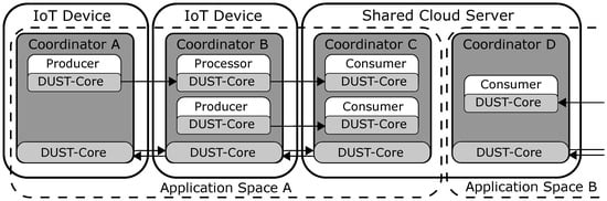 The DUST system architecture uses multiple devices (e.g., IoT devices, fog devices and cloud servers) that will cooperate to execute the application graph. The DUST system architecture is shown in Figure 3. The group of devices that help to execute a certain application graph work in the same application space. Every device that is in an application space is required to run a DUST Coordinator. The DUST Coordinators that are in the same application space communicate with each other to optimize the distributed resources consumption. DUST Coordinators that are in a different application spaces do not communicate (e.g., limit the number of coordinators to the coordinators in a single smart home and one cloud instance). Certain devices work in multiple application spaces (e.g., a cloud server) and require a DUST Coordinator for every application space.
