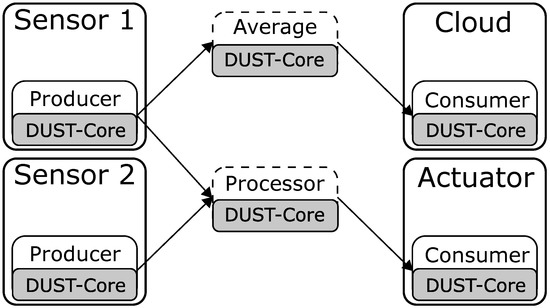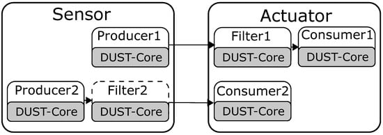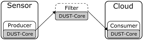 The first use case is a configuration of a sensor node that streams events to the cloud, as shown in Figure 4. The producer component generates more excessive data than needed by the consumer. Therefore, a filter is placed between the producer and consumer. The filter performs a decimation of two (i.e., only one message out of two will be passed through). The producer and consumer components are not interchangeable between devices as the data is generated in the sensor node and the events are stored in the cloud node. However, the filter component can be placed on both nodes. The task of the DUST Coordinators is to find the optimal placement of the filter component on one of the nodes within the network. The hardware of the sensor is a Raspberry Pi 3 B+ with only a single core enabled. The cloud server uses an Intel i7-7700HQ processor.