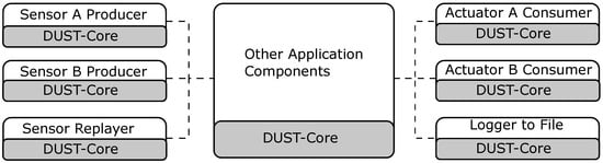 The OBU-software is based on the event-processing model (as described by Moxey et al. [4]) and implemented using the DUST-Core. We have no DUST Coordinators in the OBU because we need a fixed execution location for every application component (although this could be a future research direction). As discussed in the previous subsection, the software architecture needs to be able to handle large hardware changes with a minimal change in software. To handle this change in hardware, we construct applications with an application graph of multiple application components that stream events to each other. This software architecture allows us to create a strong hardware flexibility without changing the entire application (the processing components are reusable). When we change the event producer of consumer (e.g., the sensor hardware, actuator hardware, or the communication hardware), we only need to change the event producer and/or event consumer that is relevant and reuse the processing components. Figure 7 shows that we can implement multiple producers to read the information from the sensor and publish it in the same data format. By doing so, the hardware change is transparent to the other application components. Additionally, to changing the hardware, we can also replay stored sensor data in the same data format as the original sensor. This allows developers to stub the original sensors without the need for the physical sensors. Figure 7 also shows that the receiving actuators can also be interchanged if we write a new consumer application component to control the actuator with the same data format.