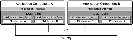 In the previous section, we described the importance of hardware transparency in the development of the OBU architecture. Next to the hardware transparency, we are also able to create the middleware transparency by using the DUST-Core as a middleware platform. The middleware interface within DUST allows us to change the middleware without the need to change the application components in the application graph. This is also a key requirement within the development of the OBU because when an original equipment manufacturer (OEM) will implement software from the Smart Highway testbed to a real vehicle, they will not use a middleware such as ZeroMQ or MQTT but will send event message on a standard from the automotive industry (e.g., Controller Area Network (CAN), Flexray or Automotive Ethernet). This change in middleware is possible because of the middleware interface in the DUST-Core. In the case that we want to send message events over a CAN-interface, we create a new middleware object in the DUST-Core which is able to send and receive message with a CAN-interface (see Figure 8). The application components do not need to be changed although there is a large change in communication middleware between the application components.