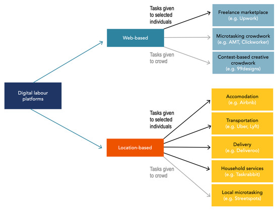 Digital labor platforms (DLPs) are the cornerstone of the gig economy. Over the past decade, they have disrupted both existing business paradigms and employment models the economy relies on. DLPs foster the matching of labor supply and demand by acting as intermediaries. Taking advantage of web technologies, platforms offer new enhanced ways of matching supply and demand of labor minimizing transaction costs with a higher level of efficiency compared to traditional intermediaries. They also provide customer-oriented services and create job opportunities with flexible schedules thanks to a “pay-as-you-go” workforce [24]. Platforms are however more than just mere tools for matching labor supply and demand. Using algorithms, they manage many other aspects of labor relations. DLPs give precise instructions about time, place and fulfillment of the service. (Uber, just to give an example, provide the route and the code of conduct that drivers have to respect [25]), dynamically determine working conditions [26] and fix the wage according to criteria embedded in the algorithm parameters such as location, time, and service demand [27]. Over the years, different types of DLPs have emerged that can be classified according to different criteria—type of services requested; payment and adjudication methods (bid/defined rate); tasks complexity and control over performance. An interesting taxonomy (see Figure 2) is that proposed in a recent report by the International Labor Organization [28].