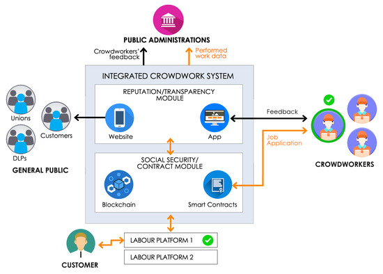 From the technological point of view, the implementation of the ISC should be supported by an integrated architecture conceived as a public intermediate layer, a “trust intermediary” [36] for the interactions between all the subjects in various ways involved in the market dynamics of the digital work: public administrations (e.g., ministries, labor inspectorates, social security institutions), crowd workers; DLPs; other actors (e.g., labor and industrial associations, potential customers and crowd workers, ordinary citizens).