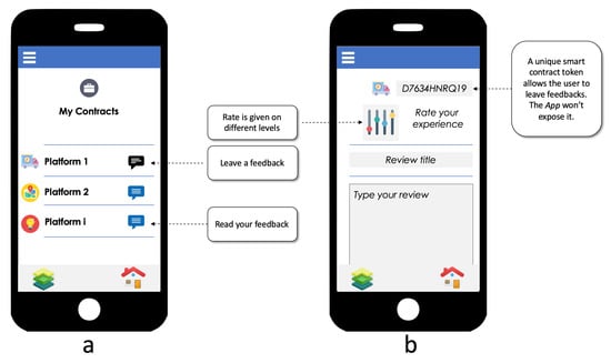 Through “My Contracts” the user visualizes his job history in the gig-economy (see Figure 6a). A list box includes all the gig-works the user performed over the time (virtually in the blockchain, see Section 4) showing the (i) DLP logo, (ii) DLP’s name, (iii) a button which indicates—according to the color changing—the chances to insert or read a feedback about that DLP.