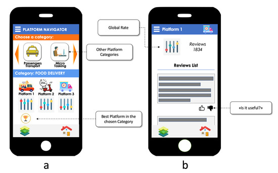 The Labour Platforms Navigator shows a list group of DLPs (Figure 7a). Once the user selects a DLP of interest (see Figure 7b)it is possible to visualize: the rating for that platform which is calculated taking into account (i) the amount of feedback received by the DLP, (ii) sentiment of the received feedback [54,69], (iii) rating from the “graphic equalizer”, (iv) timing (e.g., a DLP which was high-rated one year before with no other new feedback should be downgraded), and (v) utility of feedback.