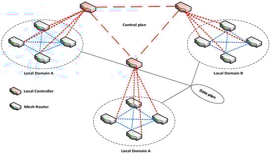 A centralized controller in SDWMN manages all the switches (mesh routers) of the network (controller–router connection is in a multi-hop). That means each router in the network needs to rely on one controller for forwarding decisions. Thus, for every new flow, each router generates a request to the controller, which responds with appropriate flow entry messages. Obviously, this scenario costs the controller more load and decreases network performance. On the contrary, in FD-SDWMN architecture, the network control has logically divided via network slicing into flat distributed controllers, each of which controls a local domain (controller–router connection is in a single-hop).