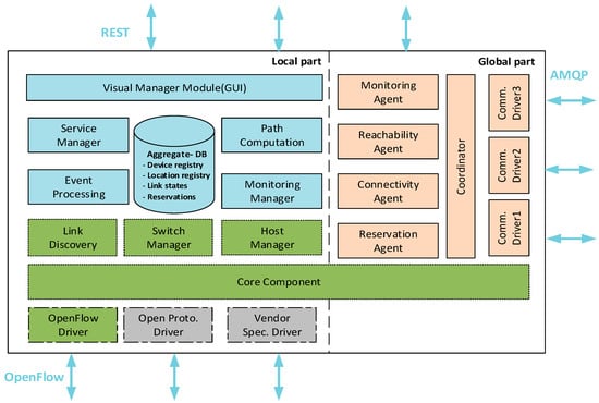 - The service manager module: supports end-to-end provisioning by receiving requests from northbound APIs for efficient network SLA (Service Level Agreement) management. It verifies SLA feasibility and respect for consulting other modules.