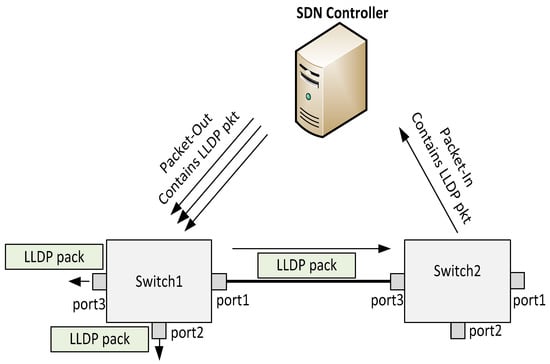 Topology discovery is critical for the efficient operation of SDN-based network services and applications, which need to have updated information that describes the network state. An SDN controller is responsible for offering this information using an efficient and reliable approach. There is no standard topology discovery of OpenFlow devices. However, most of the current SDN controller systems use the same approach implemented by the original SDN controller (i.e., NOX controller) [22]. This mechanism, named OpenFlow Discovery Protocol (OFDP) [23], is used as a topology discovery de facto scheme. OFDP leverages the Link Layer Discovery Protocol (LLDP) [24], which allows switches in LAN (IEEE 802 Local Area Network) to advertise their capabilities to each other. Figure 4 depicts a simple scenario for topology discovery, the process detailed in [22]. Although the OFDP mechanism was adopted by the majority of the current controller platforms, the controller suffers from the number of messages loaded during the process. For one cycle of topology discovery, the controller sends a Packet-Out message per every active port of the switches and receives two Packet-In messages for each of links between them. Since topology discovery is a periodical process, the OFDP mechanism affects controller performance because the number of packets in/out to/from a controller is dependent on the number of network switches and their active ports. For that, the heavy load of the topology discovery process in a controller is increased according to the network scale.