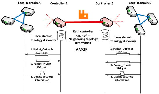 A significant reduction of the LLDP Packet-In and Packet-Out message numbers for the entire network topology discovery can be achieved in every controller of the FD-SDWMN architecture when discovering entire network topology using the aggregated topology discovery mechanism. The controller load can be calculated in two stages: firstly, when discovering links between local domain switches, depending on the number of domain members. Secondly, the load of aggregating the other neighbors’ local domain’s topology information as an event-driven message for each domain using connectivity agents of AMQP, depending on the performance of the AMQP system.
