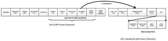 Quality of service of network forwarding devices is particularly crucial for real-time applications like video streaming. The current SDN topology discovery service does not monitor or collect the QoS of underlying network elements, in spite of the fact that it is based on the LLDP protocol, which can collect QoS properties [27]. As shown in Figure 6a, additional to the mandatory TLVs (Type/Length/Value, i.e., key-value pair with length information) fields that are used in topology discovery, LLDP has optional Type Length fields that can be customized to discover other features such as QoS properties. In [27] four optional fields were identified to carry bandwidth, delay, jitter and packet loss, with an 8 byte size of each property as shown in Figure 6b. Therefore, a customized LLDP packet for QoS collection is longer than the original LLDP packet by 38 bytes. Since the aggregated mechanism allowed applying LLDP-based topology discovery on FD-SDWMN, it also can monitor and collect QoS.