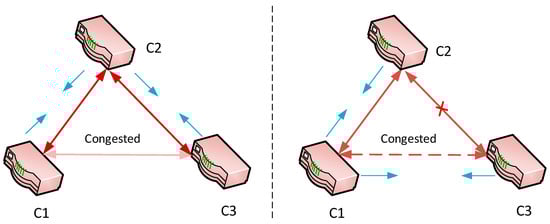 The control plane adaptation: (Left) the congested situation: C1 and C3 use the forwarding link via C2; (Right) link disruption: C1 and C3 use the congested control link with adapting information exchange frequency.
