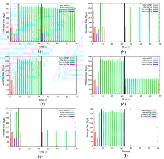 Monitoring information exchange adaptation. Different agent messages’ packets, the bootstrap and discovery stage at t = 9 s. The link was cut off at t = 33 s, C2↔C3 link is cut off. (a) C1 → C2; (b) C1 → C3; (c) C2 → C3; (d) C2 → C1; (e) C3 → C1; (f) C3 → C2.