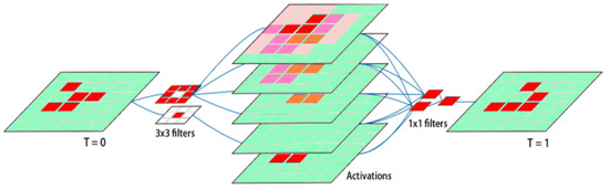 - William, G. Cellular automata as convolutional neural networks. Department of Applied Physics, Stanford University. arXiv 2018, arXiv:1809.02942. [Google Scholar]