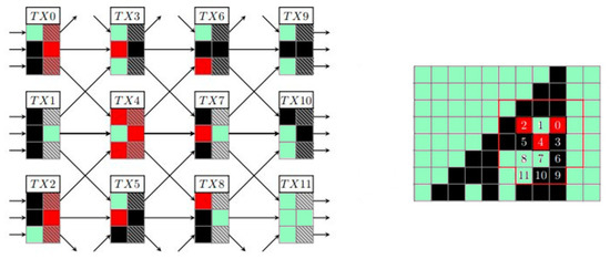 Evolution of a cellular automaton rule 110. Every non-boundary transaction spends three outputs, and generates three new ones with identical bit values. Hatching indicates “mid” flag being un-set. Numbers in the cells on the right pane correspond to the transaction numbers on the left [23].