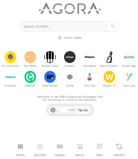 - Agora Startup Page for Bitcoin SV Applications & Services. Available online: https://www.agora.icu/ (accessed on 12 June 2019).