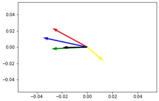 Representation of a 2D embedding space with five embedding vectors each representing a different word [38]: Red—queen, blue—king, green—man, black—woman and yellow—oil.