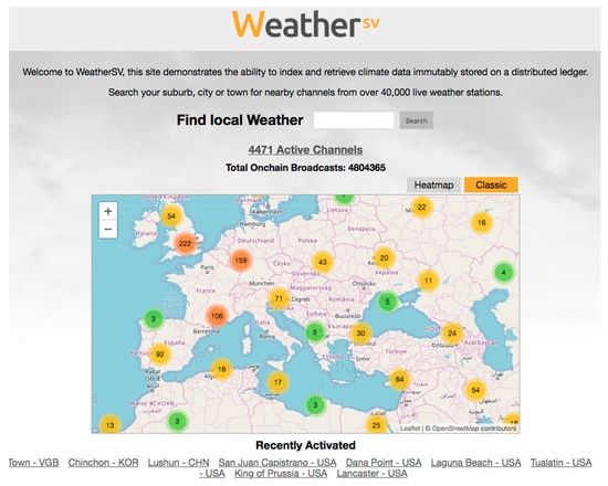 - WeatherSV, Index and Retrieve Climate Data Immutably Stored on a Distributed Ledger. 2019. Available online: https://weathersv.app/find (accessed on 11 June 2019).