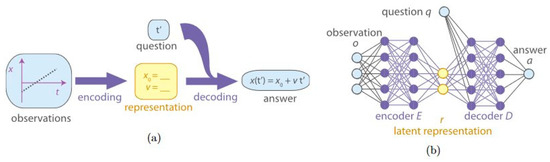 Learning physical representations. (a) Human problem analysis. Experimental observations are compressed into a simple representation (encoding). If any question is asked about the physical setting, the human should be able to produce a correct answer using only the representation and not the original data. The process of producing the answer (by applying a physical model to the representation) is called decoding; (b) Neural network structure for SciNet. Observations are encoded as real parameters fed to an encoder (a feed-forward neural network), which compresses the data into a representation (latent representation). The question is also encoded in a number of real parameters, which, together with the representation, are fed to the decoder network to produce an answer [51].