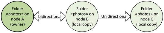 In “bilateral” synchronizations only two nodes are involved: the “owner” of the directory that is synchronized, and the other node, which has only a local copy. Bilateral synchronization can be either bidirectional or unidirectional. In the former case (Figure 1a), all the changes made on either of the two paired directories are mirrored in the other. By contrast, in the latter (Figure 1b), changes on the local copy are not mirrored on the owner directory.