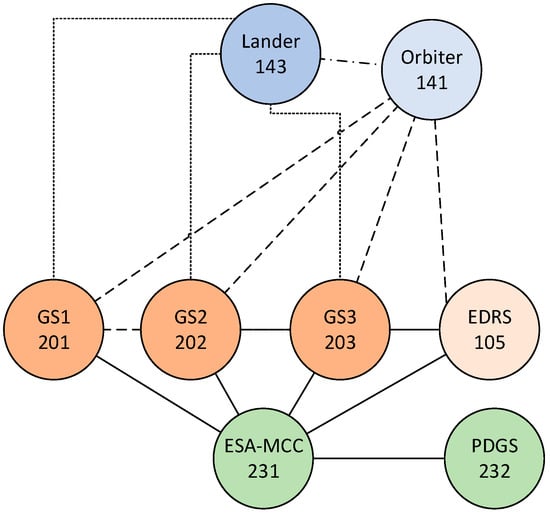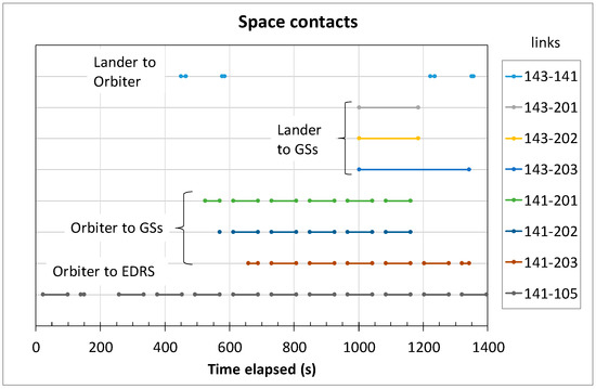 Let us now examine the characteristics of scaled-down space contacts, plotted in Figure 6 as horizontal segments. Between the Lander (143) and the Orbiter (141) connectivity is very scarce, due to the fast orbital speed of the Orbiter. We have only two short pairs of contacts (first pair after 400 s, second at about 1200 s). Their very short duration limits their contact volumes. The Lander is also directly connected to the three GSs (201, 202, 203), with one long contact each, starting towards the end of the experiment (from 1000 s). Contacts between Orbiter (141) and GSs are much more frequent, and even more frequent for the link to EDRS (105), whose contacts are also uniformly distributed over time, with a significant gap only at 200 s.
