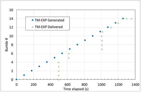 In Figure 8 we have plotted two series, “TM-EXP generation” and “TM-EXP delivery”. For each bundle we have two markers on the same horizontal line, as the ordinate is the bundle number. The interval between these two markers denotes the time elapsed from generation to delivery, i.e., the delivery time. Bundle generation is performed at regular intervals, while delivery is in bursts, due to intermittent connectivity of space links. No bundles are delivered before about 470 s, as the first opportunity to leave the Lander is offered by the first contact with the Orbiter, at 440 s (see Figure 6). Bundles generated before this time must be stored by the bundle protocol and wait for the contact to open. When this happens, all bundles are almost immediately passed to the Orbiter (the propagation delay between Lander and Orbiter is negligible), and then from the Orbiter to ESA-MCC. Here the propagation delay is longer (23 s) but connectivity is very good, as contacts from the Orbiter to the three GSs or EDRS are many and with small gaps. The best route is dynamically selected, bundle-by-bundle by CGR [15,23]. The same happens for bundles generated after closure of the first contact to the Orbiter, which have to be stored on board until the second Lander-to-Orbiter contact opens (bundles 5 and 6) and then for those generated after its closes and before the direct contacts from Lander to the three GSs open. After the burst of old bundles (7–10) waiting for this opening, new bundles are delivered either via direct contact to GSs or via Orbiter 1 at regular intervals.