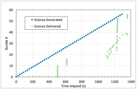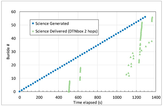 Now we can move on to the science data. First, we will examine the case of direct delivery using DTNperf, which is our benchmark case (Figure 9). Bundles are much more frequent (about one every 21 s) than in the previous case. Because of limited connectivity from the Lander, there are th0e same two delivery gaps as before. The main difference is that now bundles are often delivered out of order. Although this is allowed by DTN specifications [5], this is a symptom of the challenges posed by concurrent traffic. In fact, while gaps are due to lack of connectivity, disordered delivery is mainly the result of concurrent bundles of higher priority, which are always forwarded first, even if generated later, thus making delivery predictions for lower priority bundles inaccurate. In this regard, it must be stressed that CGR decides on the best route (i.e., that which should reasonably ensure fastest delivery, given the contacts in the contact plan) bundle-by-bundle, as soon as the bundle arrives at the local node [23]. CGR cannot therefore take account of the forwarding delay due to higher priority traffic that appears later. As a last positive remark, we can note that all bundles are delivered by the expected end of the experiment.