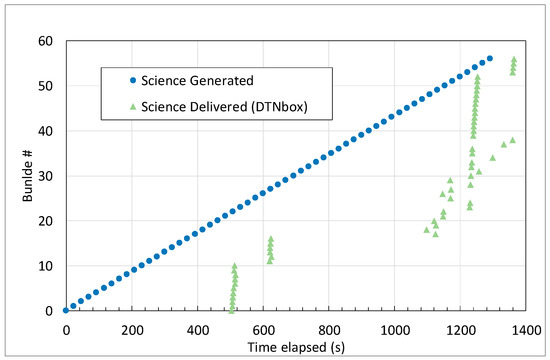 Now, let us examine the case of alternate delivery via DTNbox, which is the focus of this work. Although delivery results (Figure 10) are not exactly the same as before (Figure 9), which would have been impossible because the transmission mechanism is different, they are very similar. Comparing the two figures, it is evident that the delivery time penalty due to indirect delivery via DTNbox is negligible in space environments. In particular, the delivery of all 57 bundles is completed in roughly the same time as in the previous case (by inspection of numerical data we can see that it takes just 6 s more) although larger variations can be found on single bundles.