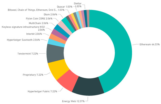 A summary of technical trends extracted from the original dataset illustrate the prominence of classified energy applications (Figure 6), blockchain platforms (Figure 7), and consensus algorithms (Figure 8). Although these details are particularly useful for establishing the current approaches and trends, such trends should be regularly evaluated to ensure changes based on best-practices are captured. However, such longitudinal analysis greatly depends on accurate and accessible information being openly shared by grid operators and energy providers.