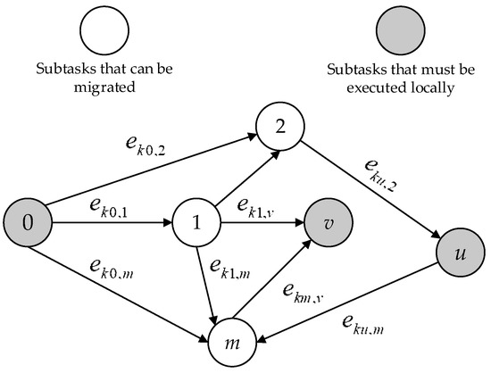 As can be seen from Figure 2, the subtasks can be divided into two groups. In the first group, all subtasks must be executed locally on the devices, such as subtask 0, subtask u, and subtask v, which belong to the non-migratory task set . In the second group, subtasks can be migrated to the edge cloud, such as subtask 1, subtask 2, and subtask m, which belong to the migratable task set . In the second group, not all of the m must be migrated to the edge cloud for execution, and the decision on migration depends on several factors such as the network condition and data size the task requested.