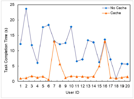 The algorithm was implemented using Matlab 2012a. In the first evaluation, the maximum population iteration number for GA was set to 200. The values of user number N and task type K were set to 20 and 5, respectively. Each user is supposed to submit one task. The cache capacity of the edge cloud is 5000 MB, the amount of data transferred by all subtasks follows the normal distribution. In order to intuitively evaluate the complexity of the algorithm, we recorded the running time of the simulation program. The running time was around 11 seconds in a Windows 10 Operating System with Intel Core i7 CPU and 8 GB memory. In order to analyze the impact of the task cache on task execution performance, we compared the task completion time and energy consumption in two scenarios, with a cache policy and without a cache policy. The results are shown in Figure 3 and Figure 4.
