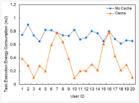 Because the cache capacity on the edge cloud is limited, only some types of tasks can be cached. As can be seen from Figure 3 and Figure 4, the tasks performed by User 7 and User 16 were not cached on the edge cloud. Therefore, the optimal subtask migration strategies solved by the genetic algorithm indicates that for the tasks performed by User 7 and User 16, the execution time and energy consumption are the same as the non-cache strategy. It can be seen from these two figures that the task completion time for User 2 decreased by 95.23%, and the task execution energy consumption for User 3 decreased by 85.84%. The cache strategy has a great influence on task execution time and energy consumption. Caching tasks on the edge cloud can reduce the time and energy consumption required for task data transmission.