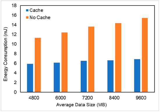 As shown in Figure 5, in terms of energy consumption, using the cache policy outperforms using the non-cache policy, the energy consumed by the task is much less when using the cache policy. As the task data volume increases, the rate of increase in energy consumed by task execution using the non-cache policy is much faster than using the cache policy. When the average data size was 9600 MB, the energy consumption decreased by 55.38% when using the cache policy. This indicates that the energy saving effect brought by the caching strategy becomes more and more obvious for tasks with a large amount of task data transmission.