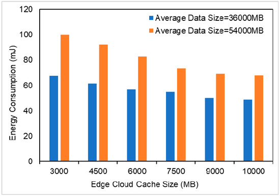 We updated the cache capacity of the edge cloud, and the number of users was 60 and the types of task was set to 8. As is shown in Figure 6, as the cache capacity of the edge cloud increased, the energy consumption of the 60 users was reduced. The average data sizes were set to 36000 MB and 54000 MB, respectively, and when the edge cloud size was 4500 MB, the energy consumption decreased by 33.29%. The reduction in task execution energy consumption is due to the support of the cache capacity on the edge cloud. At the same time, it can be seen that the greater the amount of task data transmission, the more energy is consumed.