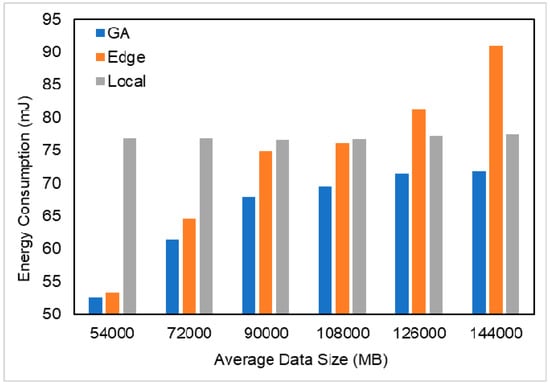 We compared the energy consumption in terms of three strategies, (a) cache-based subtask migration algorithm (GA); (b) all tasks executed in the edge cloud (Edge); and (c) all tasks only executed on mobile devices (Local). As can be seen from Figure 7, the cache-based subtask migration algorithm outperformed the others. Using cache and task offloading can effectively reduce the energy overhead of mobile devices. At the same time, it can be seen that when the amount of data for a task is small, the difference in energy consumption between strategy GA and Edge are also small. In addition, with an increase in the amount of data transmission, the energy consumed is gets closer and closer for the Edge and Local strategies. Compared with the Edge and Local strategies, the maximum improvement in energy consumption for the GA strategy is21.16% (when the average data size is 144000 MB) and 31.6% (when the average data size is 5400 MB).