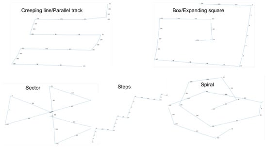 The general patterns followed by vessels involved in a search-and-rescue mission are generally pre-defined as “Norms”, in terms of Maritime Safety/Safety Regulations, although in many cases these patterns need to be modified based on the needs and the area of each SAR mission. Based on the idea of adjusting the SAR pattern to fit the area to be searched, Reference [] examined a heuristic method to implement a tool for automatic search pattern generation.