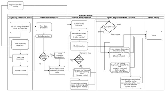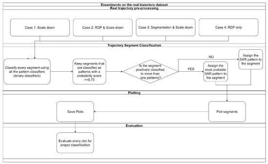 The current work focuses on the classification of SAR maneuvers that may happen during a vessel’s trip and thus cannot be directly compared to methods that classify the whole voyage as a SAR mission or not (e.g., References [,]) or methods that search for more composite naval events that examine more than one vessels in tandem (e.g., References [,]). However, it proposes a new classification approach for documented maneuvers such as the SAR ones, in the absence of annotated data. The contributions of this work can be summarized as follows:
