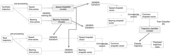 In the case of synthetic time-series data, the genetic algorithm of GENDIS is applied to learn the important shapelets, which are then used to extract the shapelet feature representation of the time-series. The same extracted shapelets (model) are used to transform the real time-series to feature vectors. Any classifier can be trained using transformed annotated data (either manually annotated real data or synthetic data) and applied on the vector representations of real trajectories.