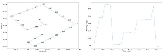 The resulting bearing values at any moment are expressed in degrees and cannot be lesser than 0 degrees and greater than 360 degrees. These four movements are combined in a specific order in order to synthesize the respective maneuver and are repeated depending on a given loop value. The loop value represents the times that this kind of movement must be performed. If it’s mentioned otherwise, the loop value is a random integer between 2 to 6 (in the experiments, values 2, 3, 4 have a higher probability). Every simple movement can have speed, frequency and bearing noise. Limits for these kind of noise are ±2–60 m/s, ±3–15 min, ±0–3 degrees respectively. Figure 4 presents an example of the resulting synthetic pattern for an expanding square maneuver (left) and the respective plot for the bearing (right).