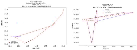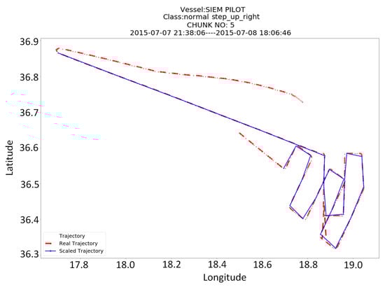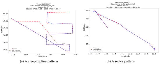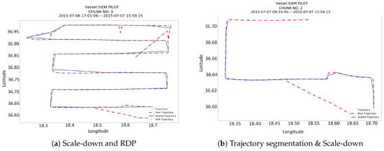 Figure 6 depicts an example from a trajectory of the SIEM PILOT vessel, which has been pre-processed with the four different methods. The plot on the left (Figure 6a) shows how the Scale-down and RDP methods compare to the original trajectory (of 500 points length), whereas the plot on the right (Figure 6b) shows the result from the application of the trajectory segmentation method to small chunks (of 180 points length). The RDP & scale down method had the same result as the Scale down method and thus has been omitted from the plot. In the first case the classification method detected the creeping line pattern, whereas in the second case a steps pattern has been detected in the smaller chunk. It is worth mentioning that all other chunks have not been classified as any SAR pattern.
