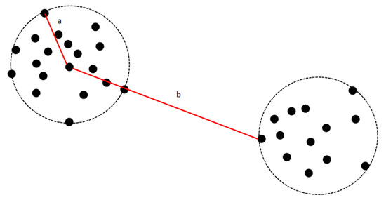 According to Equation (6), the cutoff distance of user is taken as the maximum value of the difference between two elements of vector . Obviously, the distance difference between users belonging to the same cluster is relatively small, whereas the distance difference between users in different clusters is relatively large, as shown in Figure 3.