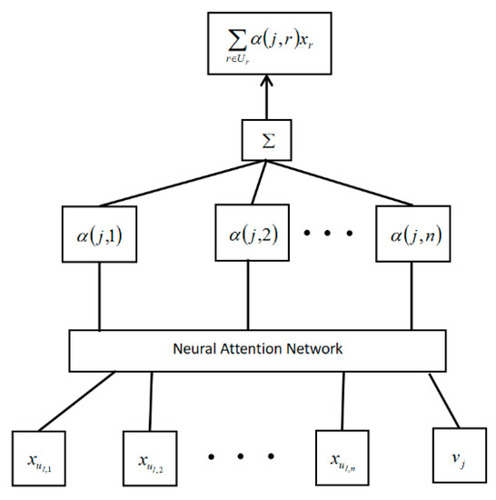 The user embedding vector the , the target item embedding vector as the input of the neural attention network, the weight matrix of the attention network is expressed by , , , as the bias vector, It is activated by the Rectifier Linear Unit () [37] function, and then item to the weight vector . Finally, the score is normalized by softmax [38]. The process is shown in Figure 4.